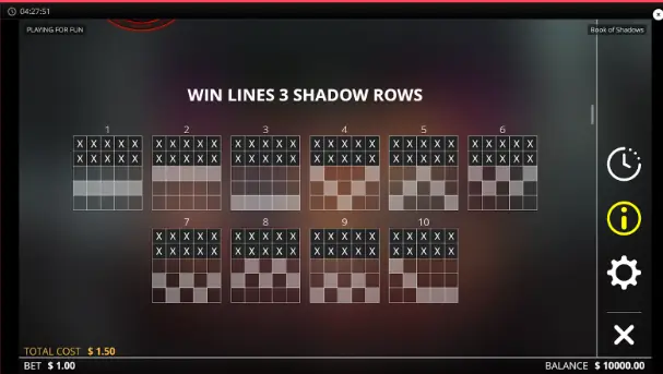 Filas de Sombra (Shadow Rows) Esta es la primera decisión que tomas y una de las más importantes. El juego te permite elegir si quieres jugar en un tablero de 5×3 (10 líneas de pago), 5×4 (15 líneas) o 5×5 (20 líneas). Activar más filas aumenta el coste de tu apuesta, pero también incrementa tus posibilidades de ganar y de activar los giros gratis.